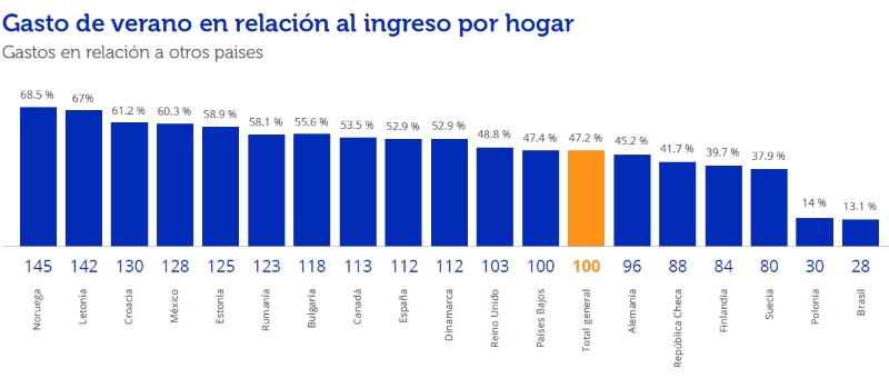 Undersøgelsen viser, at spanierne vil bruge helt præcist 52,9 procent af deres månedsløn på sommeraktiviteter herunder rejse-, indkøbs- og sociale aktiviteter, og vi danskere havner på præcis samme procentsat.