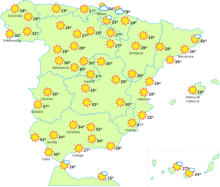 Temperaturerne vil stige i hele landet, undtagen på den sydlige Middelhavskyst, hvor den forbliver uændret. De højeste temperaturer forventes bliver på over 35 grader, og det finder vi i de indre områder af halvøens sydvestlige del samt i de indre områder af Galicien og De Kanariske Øer.