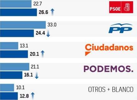Unidos Podemos falder tilbage i forhold til valget i juni. Det formodes, at Sánchez har været i stand til at få tidligere PSOE-medlemmer tilbage, efter de var flygtet til Podemos.