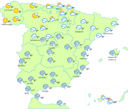 Stigende nattemperaturer i Ebro-dalen, Andalusien og på De Baleariske Øer, mens de falder på De Kanariske Øer. Frost i det meste af halvøens indre egne.
