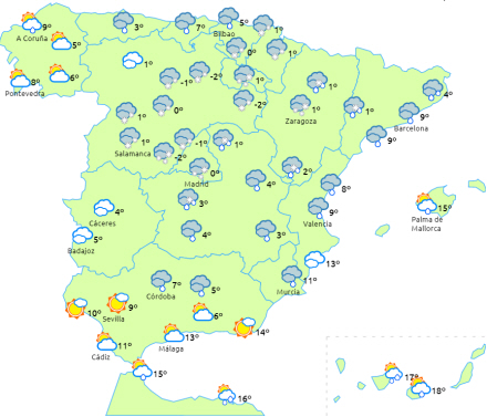 Overskyet himmel med udbredt nedbør, der lokalt kan være tung og vedholdende og endog meget voldsomt på Costa del Sol og Valle del Guadalhorce. Stigende temperaturer på 12 til 17 grader og syv til 13 i nat.