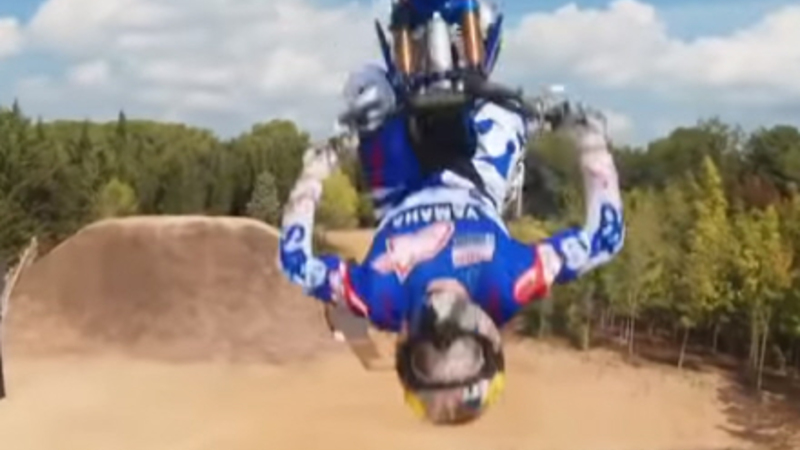 VIDEO: Lynhurtig drone følger med og tager billeder, mens motocross-legende giver imponerende opvisning af halsbrækkende stunts på sin tohjulede ræser.
