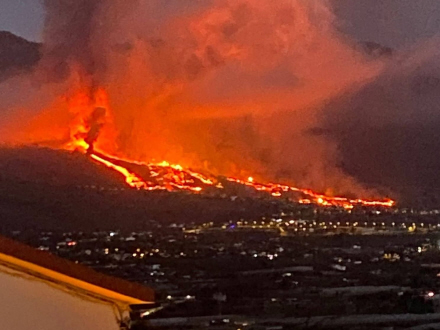 Bølger af sort og hvid røg stiger op fra vulkanudbrud på kanarieøen La Palma, mens 1.075 grader varm lava breder sig fra to sprækker med 200 meters mellemrum.