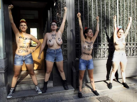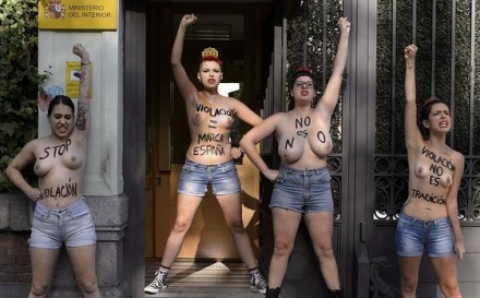Det blev for meget for fire medlemmer af kvindebevægelsen 'Femen'. Torsdag morgen mødte de topløse op foran indenrigsministeriet med 'voldtægt', 'Spaniens varemærke' og 'stop voldtægten'.
