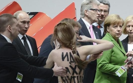 8. april 2013: Aktivist fra Femen protesterer mod Putin, da han sammen med Merkel besøger en messe i Hannover