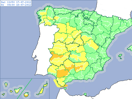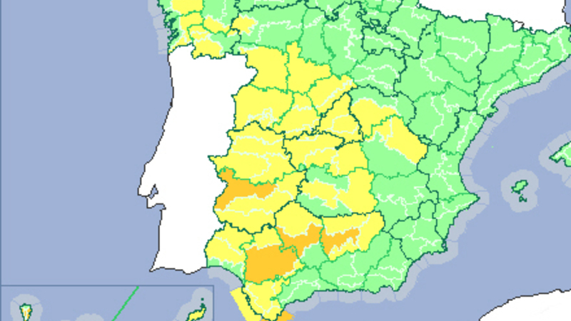 Der er ”orange” varsel i Córdoba, Jaén og Sevilla, hvor termometret i dag banker op på 40 grader og ”gult” varsel for Huelva og Cádiz. I den sydvestlige del af landet i Cádiz Provinsen er der desuden varsel om hård vind, og myndighederne advarer om store bølger.