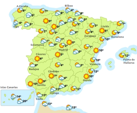 Madrid letskyet, 1–10 grader, Barcelona letskyet, 5–13, Valencia sol, 9-16 og Málaga sol med 12–16 grader.
