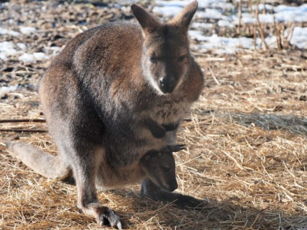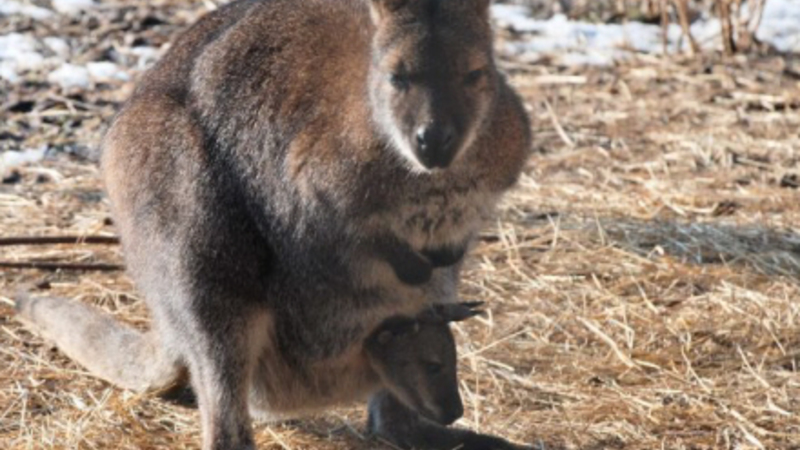 Der er tale om en rødhalset wallaby-kænguru, som stadig ligger i sin mors pung. Det er derfor kun havens plejepersonale, der har set noget til den nye langbenede beboer.