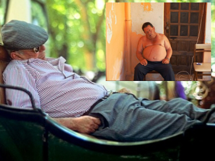 På billedet ser man en overvægtig mand med bar mave, der sidder og sover i en stol. Og på det andet en ældre herre, der tager en lur på sofaen.