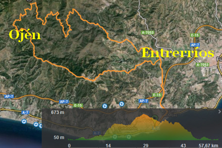 Fra narkoafvænningscentret Centro de Drogodependencia i Entrerríos gik turen ud af skovstien – som rent faktisk er en brandsti – langs den sydlige del af bjergkæden Alpujata med kurs mod Ojén. Stien snor sig langs skråningen uden de store niveauforskelle og kan fint tilbagelægges til fods.