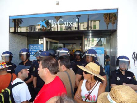 11 medlemmer af det sydspanske fagforbund El Sindicato Andaluz de Trabajadores (SAT) trængte mandag morgen ind i sparekassen La Caixas filial i Puerto de Santa María som en del af protestmarchen Andalucía en pie (Andalusien går). Samtlige 11 blev anholdt af politiet og fængslet.