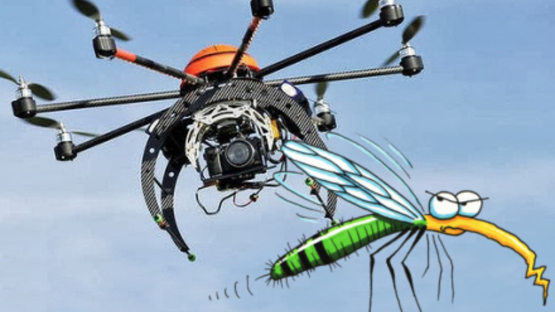 Et lille flyvende dims med indbygget kamera afsøger stillestående vand, hvor der typisk findes mange myggelarver. Dronerne bliver sat ind i områder, hvor der er vanskelig adgang.