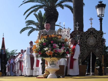 Dagen derpå, pinse søndag, er lige så følelsesladet. De mange tusinde pilgrimsfarende deltager i en gigantisk udendørs messe med biskopen af Huelva. Til højre stavene fra de forskellige broderskaber