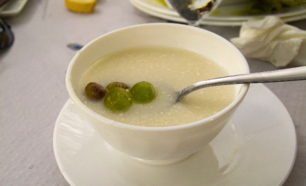 225 gr. mandler uden skal, 4 skiver daggammelt hvidt brød uden skorpe, 6-8 fed hvidløg, 3 spsk. god hvidvinseddike, ½ dl. olivenolie, 1 l. koldt vand, salt, halverede, udstenede grønne vindruer.