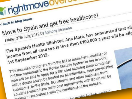”Den spanske sundhedsminister, Ana Mato, har meddelt, at alle, der har lovligt ophold i Spanien og hvis samlede indkomst før skat er på mindre end 100.000 euro om året, vil være berettiget til gratis lægehjælp fra 1. september 2012.