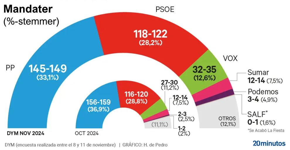 Disse resultater adskiller sig tydeligt fra den seneste DYM-måling for 20minutos, ifølge hvilken de to største partier ville blive mest påvirket og miste opbakning, selv om det ville være PP, der ville bevare førstepladsen med samme resultat som ved valget i juli 2023: 33,1 % af stemmerne, næsten fem point over PSOE. Ikke alene ville socialisterne ikke genvinde terræn efter DANA i denne meningsmåling, men de ville også falde i forhold til sidste måned og miste seks tiendedele af et point til 28,8 %. Vox ville ifølge DYM stige med mere end et procentpoint til 12,6 %, og Sumar ville ikke miste støtte på trods af Errejóns sag og ville stagnere på 7,5 %.