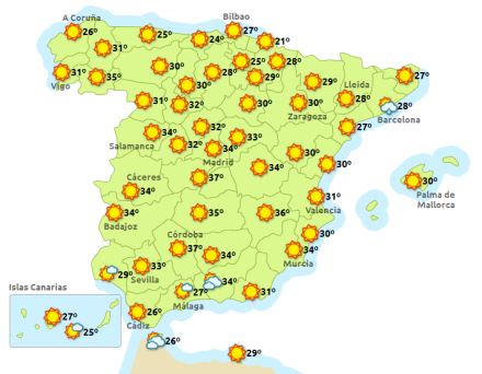 I Madrid er termometeret nu steget til 35 grader, i Córdoba 38, Toledo 37, Jaén 36, Badajoz 38, Granada 38, Cáceres 38, Lugo i Galicien 32, Ourense 38 og Pontevedra 32.