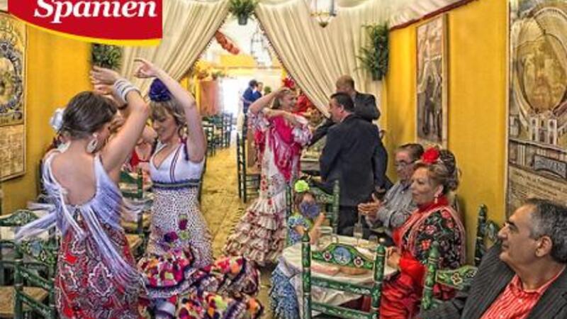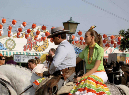 Under den åbne himmel er stemningen lige så intens som indendørs. Ryttere iført stramme bukser, støvler og bredskyggede hatte rider gennem området sammen med deres bagsæde-passagerer; kvinder i farvestrålende flamenco-kjoler.