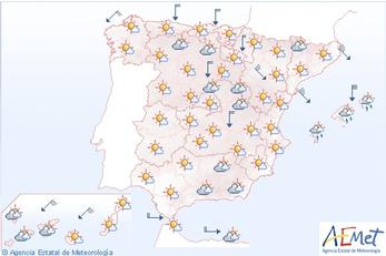 I de nordøstlige egne bliver det koldere. På Balearerne mulighed for torden, men i løbet af dagen kommer der igen nogen opklaring fra syd.