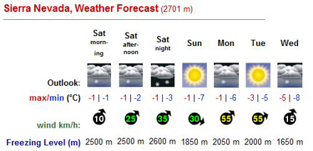 Hvis du vil tage til Sierra Nevada som 'snelivs-nyder' skal du sørge for at tjekke vejrudsigten for området. Det er nemlig en forudsætning for en god oplevelse, at du har solen med dig og ikke for meget blæst.