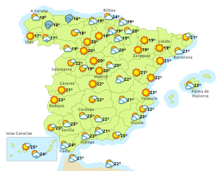 Vejret i Spanien, lørdag klokken 14:00