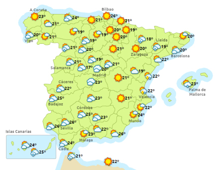 Skyfri himmel i det meste af landet i dag og kun lidt spredte byger i Catalonien, Valencia og de vestlige Kanariske Øer, hvor der kommer stærk...