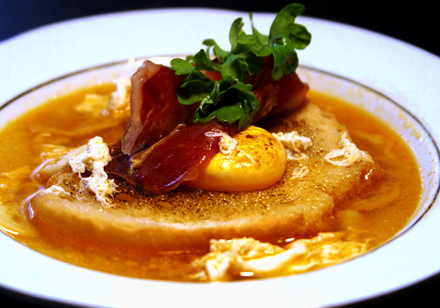 Skær hvidt brød i tern. Varm olivenolien i en gryde og svits brødterningerne gyldne. Tilsæt hvidløg og lad det få en smule farve. Krydr med paprika og salt og hæld fonden i. Læg låg på og lad det simre i ca. 15 minutter. Fyld 4 ovnfaste skåle med suppe og hæld forsigtigt et æg i hver skål. Sæt dem ind i en forvarmet ovn ved ca. 200 grader i omkring 10 minutter. Server suppen meget varm.