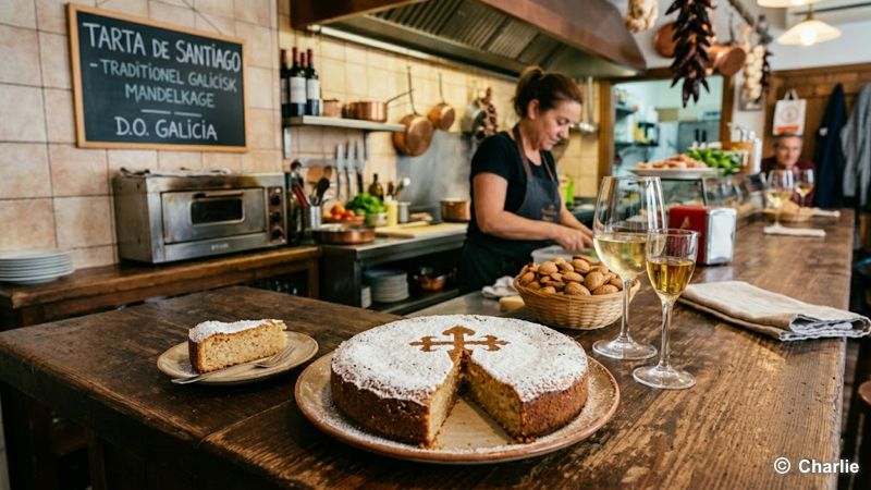 Det bør du også smage i Galicia: Empanada gallega, Tarta de Santiago – mandelkage med Sankt Jakobs kors i flormelis. Albariño, efter min mening Spaniens bedste hvidvin til fisk og skaldyr.
