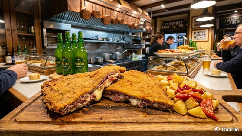 Når jeg er i Asturias består mindst et af mine måltider af Cachopo. Den klassiske version består af to store kalvefileter fyldt med jamón serrano og smeltet asturisk ost, paneret og stegt gyldenbrun. Der findes også andre varianter med queso de cabrales, gedeost, Cecina og karamelliserede løg. En rigtig Cachopo fylder næsten to tallerkener, og derfor er det normalt at være flere om at dele.