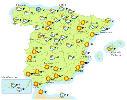 Madrid får i dag letskyet vejr med mellem otte – 12 grader, Barcelona letskyet ni – 15, Valencia letskyet ni – 14, og Málaga letskyet med mellem 11 – 20 grader.