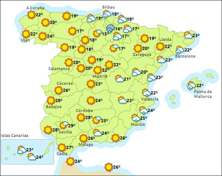 Madrid får i dag mellem 9 – 26 grader, Barcelona 15 – 24, Valencia 18 – 24 og Málaga 19 – 25 grader.