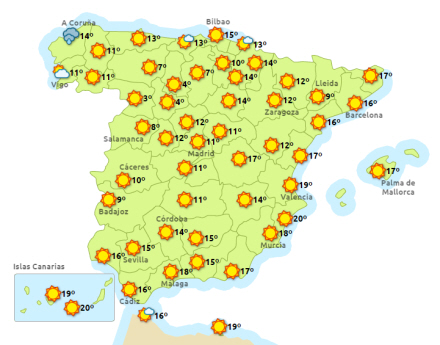 Valencia følger de to største byers vejr og kan også tilbyde sine indbyggere en hel dag med sol. Dog bliver der lidt varmere i Valencia, hvor temperaturen vil svinge mellem 5 og 19 grader.