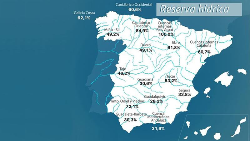 Samlet set ligger Spaniens vandreserver lige nu på 44,4 procent af den samlede kapacitet. Reservoirerne har i øjeblikket 24.911 kubikhektometer vand, hvilket i den seneste uge er steget med 359 kubikhektometer. Det svarer til en forøgelse på 0,6 procent af reservoirernes nuværende samlede kapacitet.
