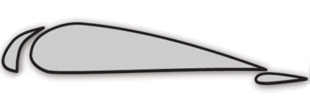 Illustration af vinge i snit. Til venstre flat og til højre flap, der trækkes in under vingen efter start