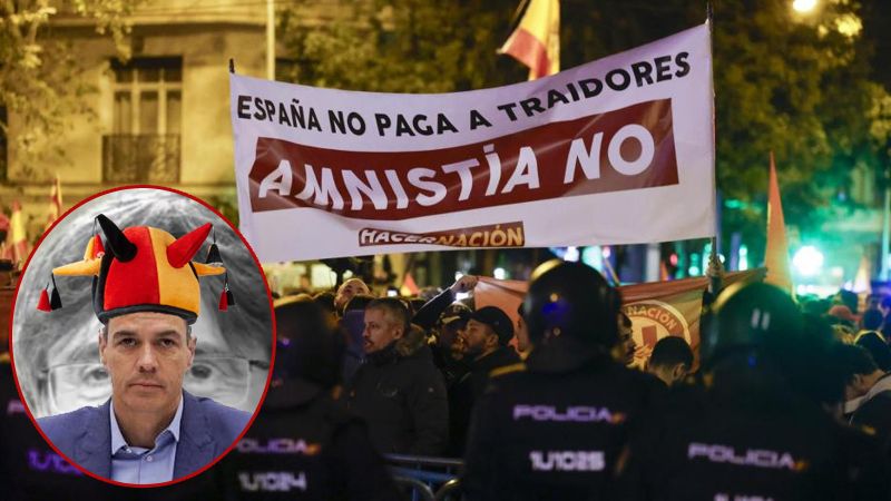 Hvad der tirsdag begyndte som en fredelig protest mod amnestiloven, kulminerede i et slagsmål ved døren til PSOEs hovedkvarter i Calle Ferraz i Madrid. Tusindvis af demonstranter - omkring 7.000 ifølge regeringsdelegationen - gik på gaden i hovedstaden for femte dag i træk for at protestere mod den mulige lov, som PSOE og Junts forhandler om for at Pedro Sánchez kan blive indsat som ny premierminister.