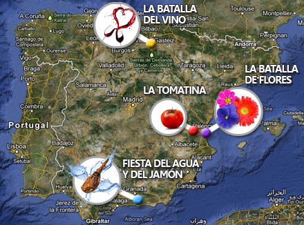 Spanierne er blandt Europas bedste, når det kommer til at give los til fester. Og det er ikke altid efter den sikre model med drinks, disko og natklubber. Vand, vin, blomster, tomater og endda rotter og olie kan danne rammen om spanske festligheder.
