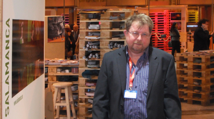 Jesper viser Salamancas stand frem. Den lægger vægt på det miljørigtige så i stedet for dyre reolsystemer, er der stablet europa-paller oven på hinanden