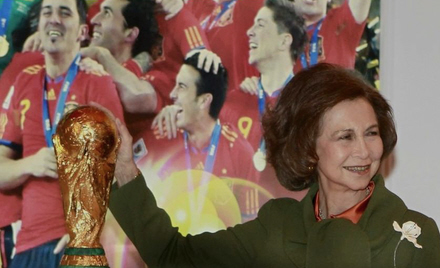 Dronning Sofia indviede FITUR i år. Efterfølgende var der spil for galleriet. Her står Dronningen med pokalen som Spanien vandt ved VM i Sydafrika