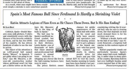 Spaniens mest kendte tyr siden Ferdinand er næppe nogen visnende viol. Sådan indleder det ansete amerikanske tidsskrift The Wall Street Journal en artikel om den spanske tyr Ratón, som som efter 11 års kamp i arenaen allerede er en levende legende.