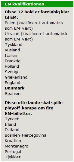 Nu har Danmark et halvt år plus det løse til at nyde forventningens glæde - og med god grund. EM sparkes i gang den 8. juni i Warszawa, Polen, og finalen spilles den 1. juni i Kiev, Ukraine, så der er udsigt til en rigtig god og underholdende sommer.