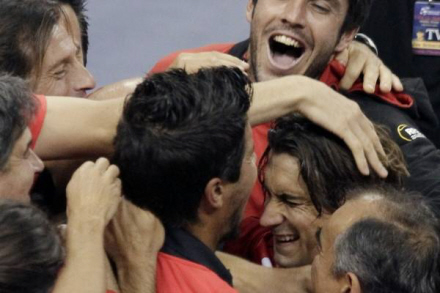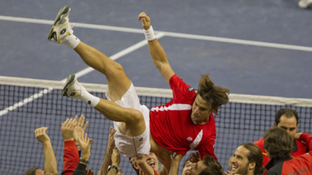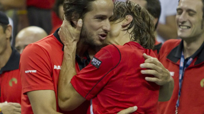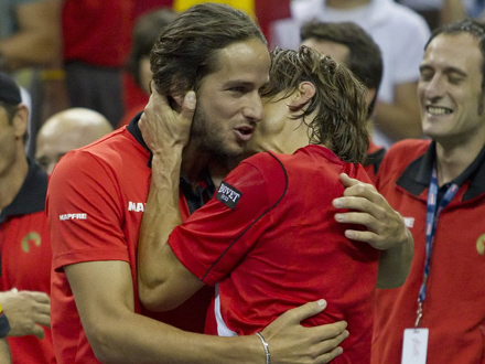 Spanien måtte denne gang dog klare sig uden verdens nummer to, Rafael Nadal, men det lykkedes Ferrer og Feliciano Lopez at slå Andy Roddick og Mardy Fish. Amerikanerne vandt kun i lørdagens double.