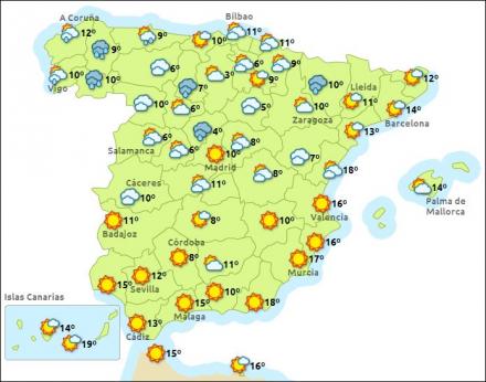 Madrid får i dag skyet og vådt vejr med mellem tre – 14 grader, Barcelona efterhånden det samme med otte – 18 grader, Valencia tiltagende skydække og mellem 12 - 21 grader, hvorimod Málaga fortsat får en del sol og mellem 11 – 20 grader.