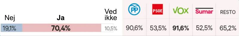 Ifølge en meningsmåling foretaget af analyseinstituttet DYM i dagene 17. og 18. november, siger 70,4 procent af borgerne 'ja' til, at PSOEs pagt med tilhængerne af uafhængighed forværrer det politiske klima i Spanien.