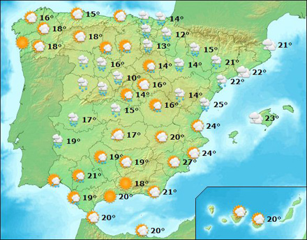 Det lavtryk, der i går trak ind over landet, har givet temperaturfald på helt op til ti grader. I Madrid er termometret for eksempel faldet fra 35 til 25 grader og i Burgos fra 28 til 18.