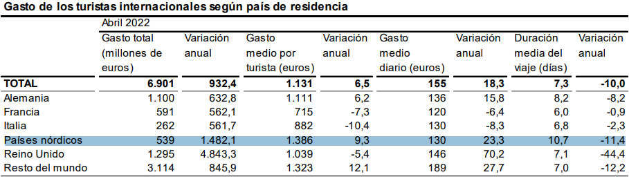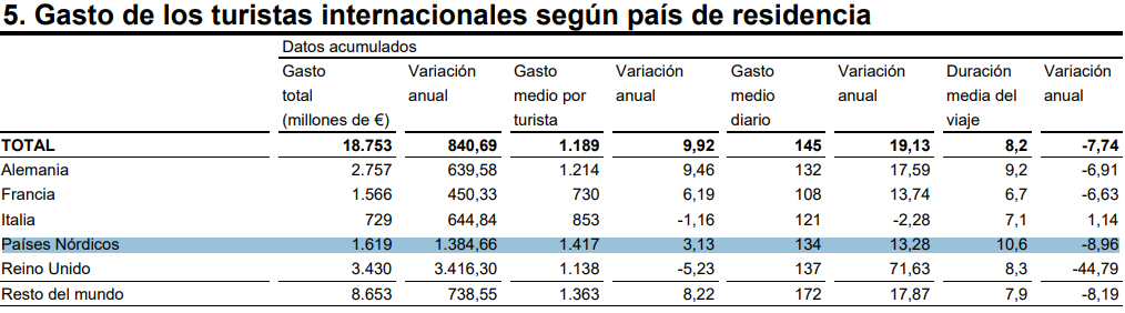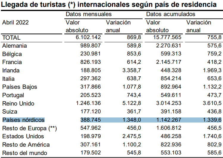 I de første fire måneder af 2022 er briterne dem, der har lagt flest penge i Spanien (18,3 procent). Derefter følger Tyskland (14,7 procent) og herefter følger os fra de nordiske lande med en fremgang på 8,6 procent: