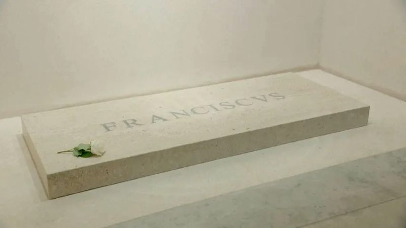 På gulvet, ved siden af kapellet for Jomfruen af Salus Populi Romani, hviler paven i sin enkle, svagt oplyste grav af marmor fra den italienske region Ligurien – hvor hans italienske forfædre kom fra – med kun én indskrift: “Franciscus” på latin.