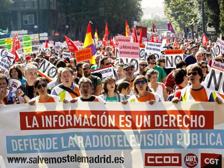 Under parolen ”Mere arbejdsløshed, flere nedskæringer – de vil ruinere landet” deltog titusindvis af personer søndag aften i massedemonstrationer i 57 spanske provinshovedstæder.