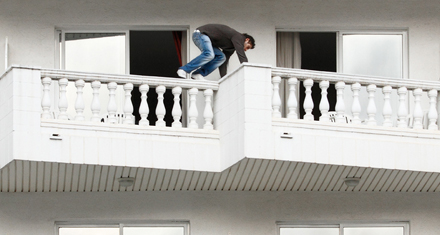Andre vidner siger, at de har set den 29-årige kravle fra en balkon til en anden.