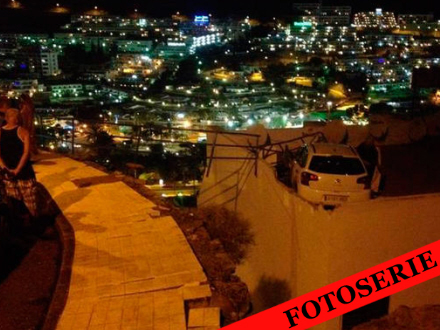 Dramaet foregik i Puerto Rico på Gran Canaria mandag aften, hvor bilen med tyskeren ved rattet fløj direkte over på taget af en bygning.