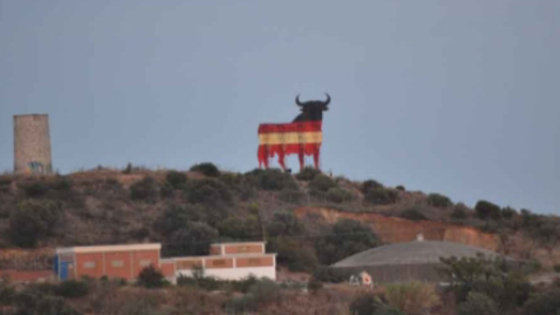 Vi taler om strukturen af den kendte Osborne-tyr, der står på en bakketop i Torreblanca i Fuengirola, som lørdag morgen var malet over med de republikanske farver; rød, gul og lilla.